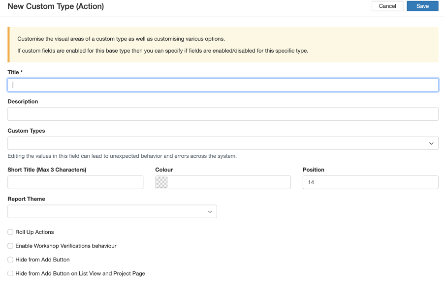 Custom TypesScope the custom types available to be created from this custom type (used for linked other records like actions). For example, you may want to only allow “Risk Treatment Actions” to be created from a Risk type, so, you would scope only that Action type and not the others.