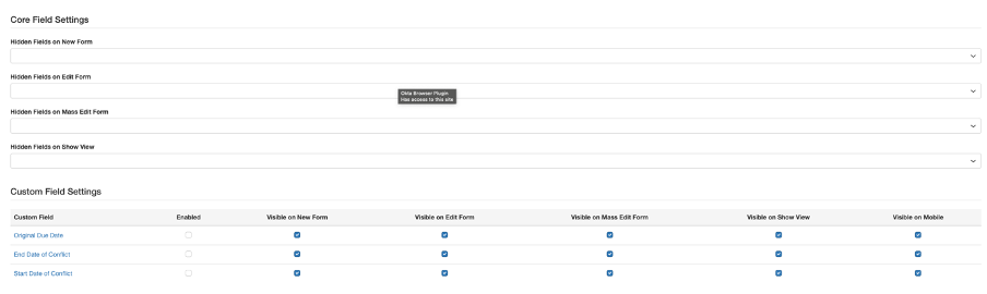 This allows you to hide and display core fields on different forms and pages. Any fields for which you can see the 'Hidden fields on New Form' box will be hidden. You can customise the 'New Form', 'Edit Form', 'Mass Edit Form' and 'Show View'.
