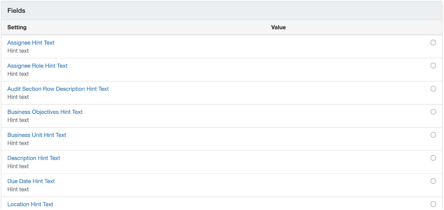 • For adding hint text under the core fields and other settings you can access them via 'Fields' and 'Properties' panel within the Custom Type.