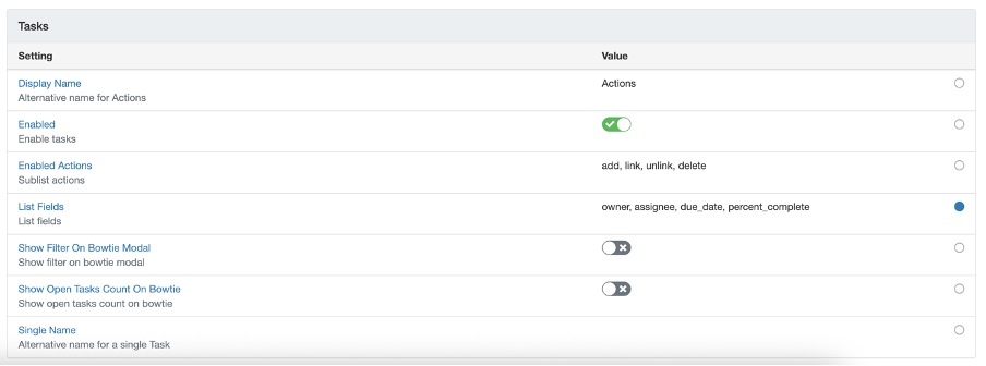 5. Scroll down to the 'Task (Action)' section and click the toggle button to enable the Action sub-panel in your module (e.g. Risk).