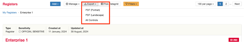 1.    Export – 'Export' button can be found on the top of individual Register summary page where you can export the summary of the register in PDF (Portrait), PDF (Landscape) version, All controls.