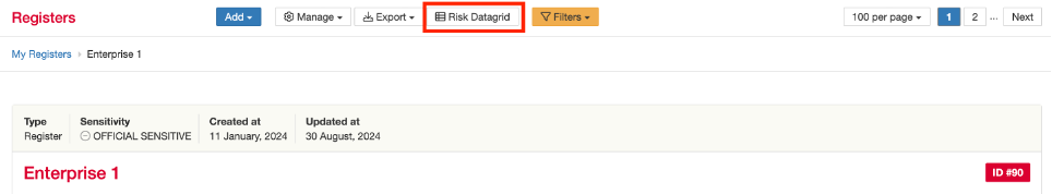 2.    Risk Datagrid – 'Risk Datagird' button on the top of the register summary page is a feature in CGR that allows quick editing of risks in a spreadsheet-style view. This allows ready comparison and direct editing of any field in any risk, even the bowtie.