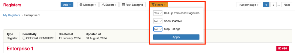 3.    Filters – 'Filters' button on the top of the register summary page provides you a choice to roll up from the child registers or should display the inactive (closed or archived) items.