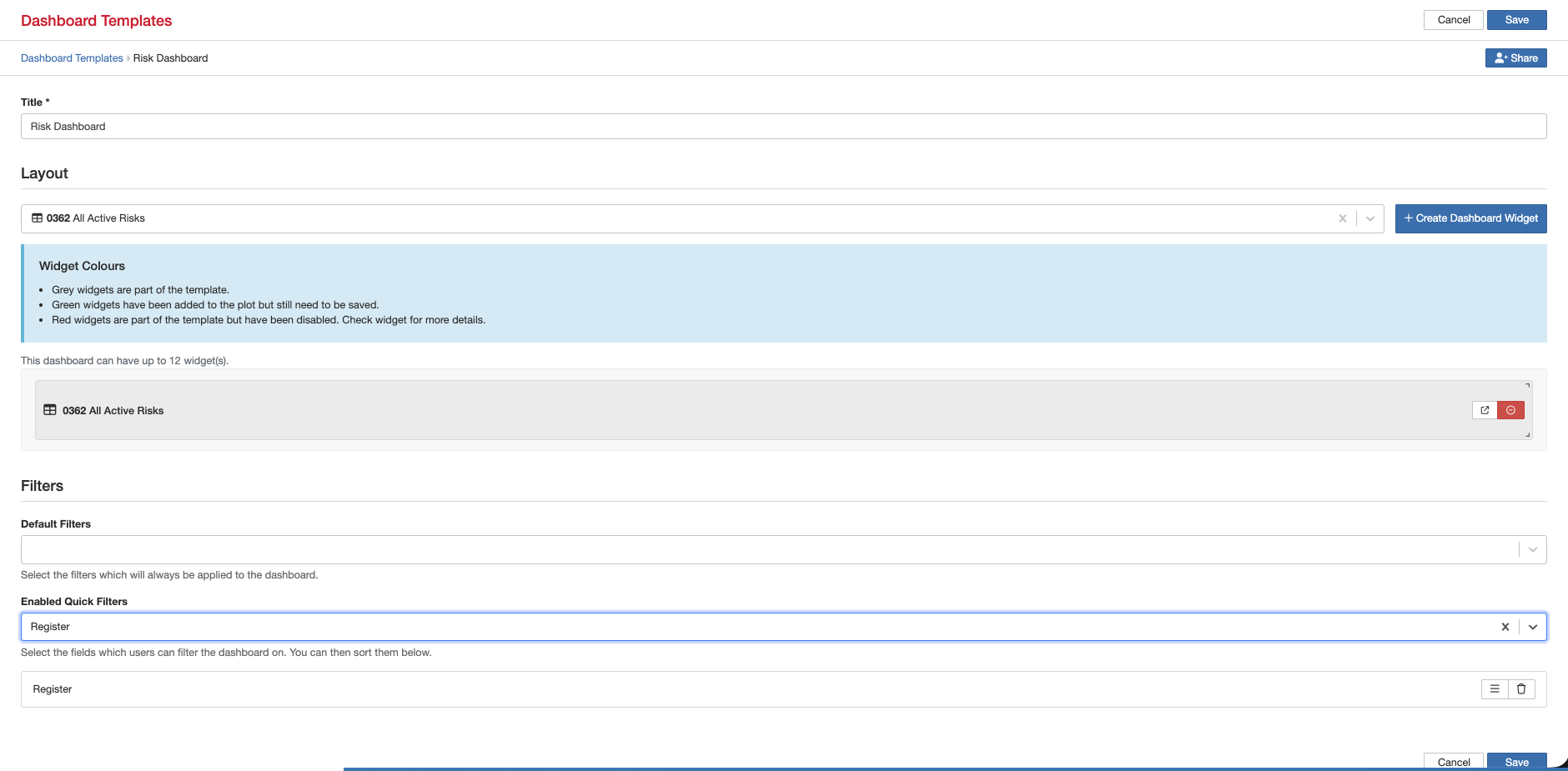 Field Description Title Enter a clear and descriptive name for your widget (e.g. Heatmap Risk). I would like to see... Select the data or field you want the widget to display (e.g. Risk). As a... Choose the visual format in which you want to display the data (e.g. Pie Chart, Bar Chart, etc.). In groups of... Specify how the data should be grouped (e.g. by ID #, Category, etc.). Filters (optional): Add any specific filters to narrow down the data shown in the widget. These filters will apply in addition to any filters set at the dashboard level. In theme... (optional): Choose a colour theme for the widget display (e.g. Green to yellow to red for heatmaps or severity levels). - Once all required fields are completed, click ‘Save’ to save your widget.