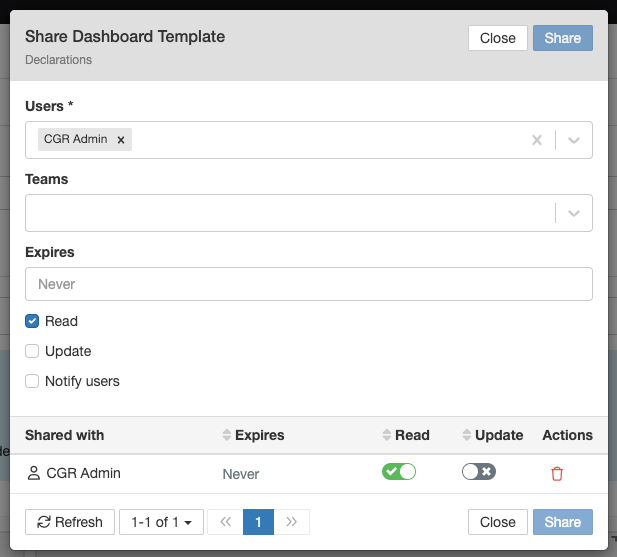 - Update: Grants edit access, allowing the selected users to modify the dashboard template.