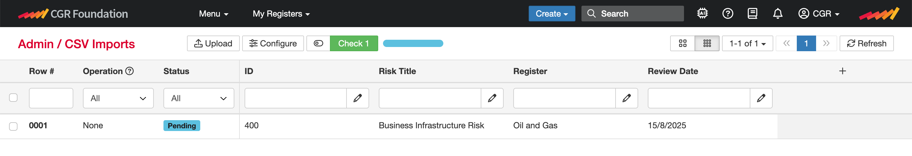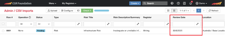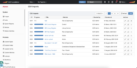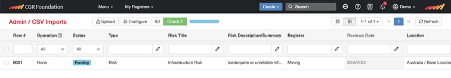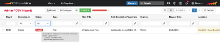 - File to be imported must be in CSV format, and have one record per row, the only exception to this rule is for risk imports where a risk (on a row) can have causes, consequences, and controls as multiple entries in a cell. The CGR Platform will then create the separate records and link them to the risks.