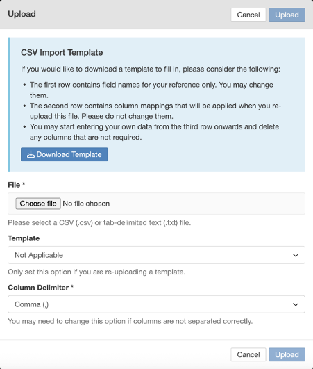 Note: An alternative to downloading the template is manually create one record in the system with all the your required fields filled in. Then that item can be exported as a .csv file and used as a template. This is helpful if you’re unable to figure out exactly which column your data would need to be entered into the spreadsheet. - Once you have your file ready, click upload button and select your file.