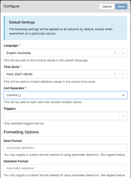 - Click the configure button to view and update the default settings for the import.