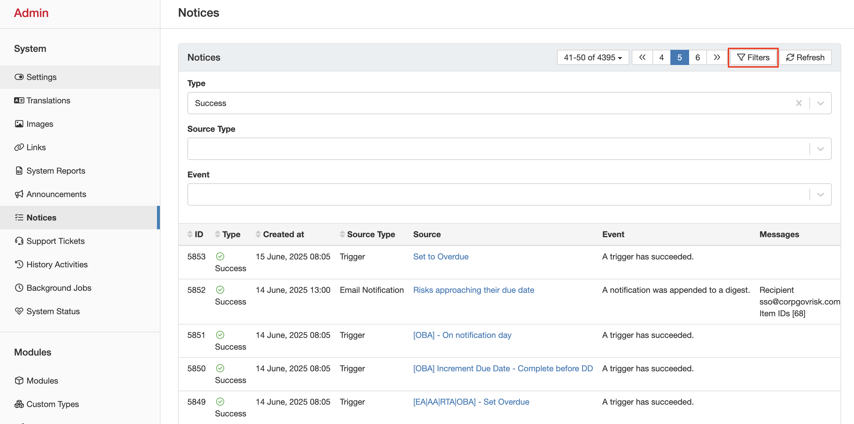 The filters allow you to narrow down the notice list to find the relevant record(s). You can filter by Type, Source Type and Event.