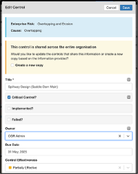 - It is important to understand customer requirements in this area. As a general example, most will prefer to not share control effectiveness – allowing this to be rated differently for the local contexts of a control across multiple risks/departments which provides insights on varying control performance. Other fields, such as those that describe the nature of the control (eg Line of Defence) are more likely to be shared, to enforce consistency in the way the control is understood.