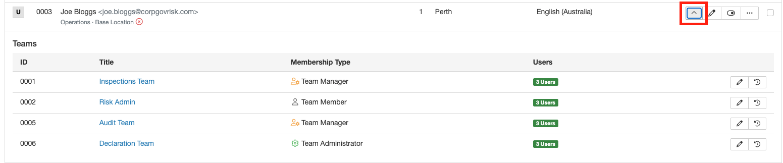 - In the user list view, select the down arrow next to the user you need to see the teams for.