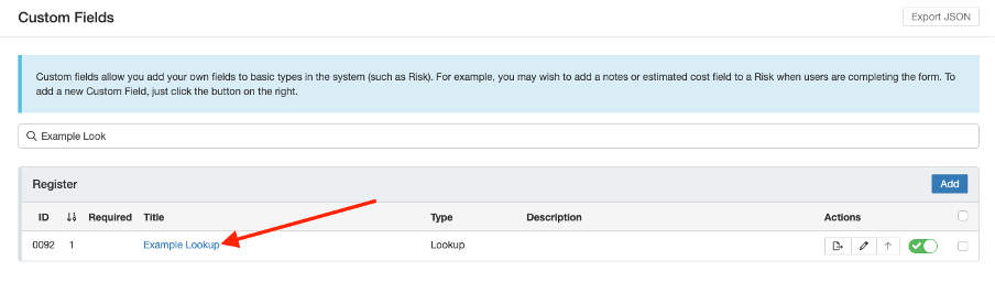 We have a lookup fields, sometimes referred to dropdown, tags or categories, against a module [e.g. risks, actions, incidents, etc]. System admins can update, create or disable lookup options from a custom field.