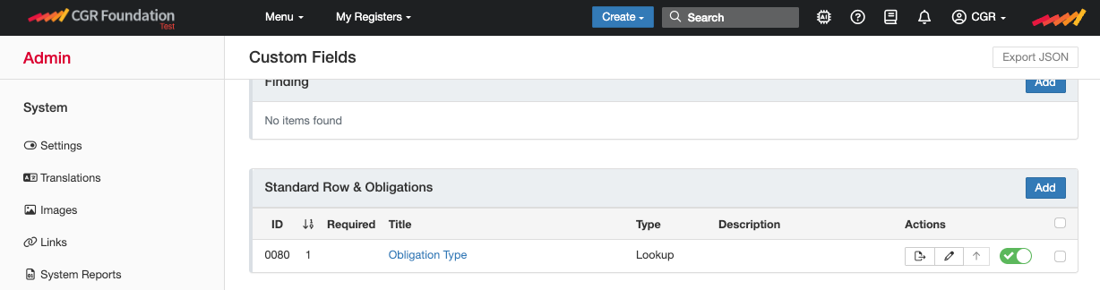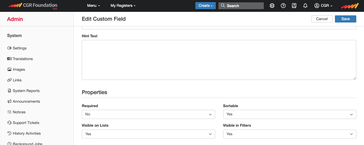 - For any CGR Core fields, at the time of this writing, they can only be enabled and disabled by CGR Admins.