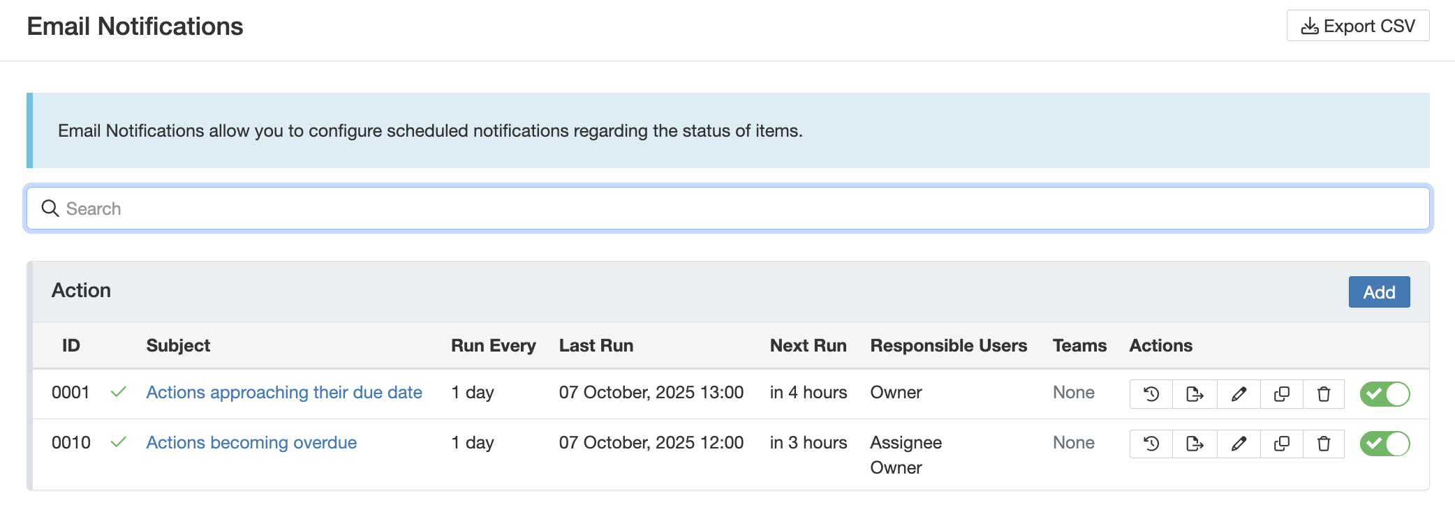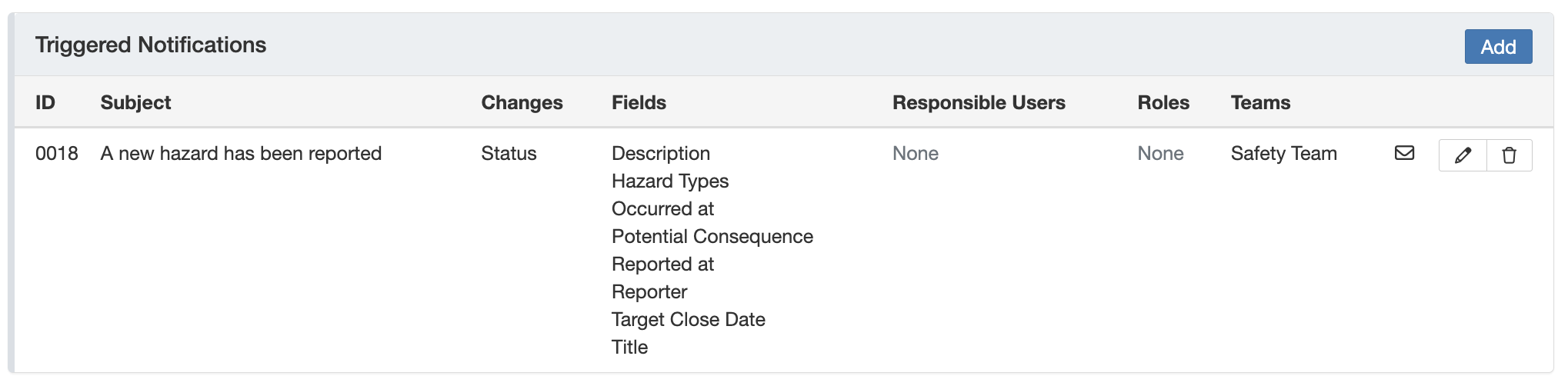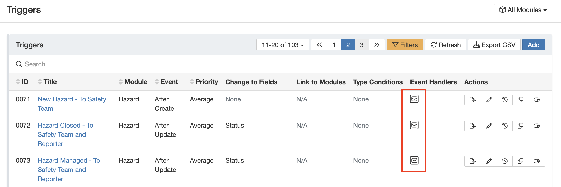 Note: Triggered notifications can be recognised through the email icon in the 'Event Handlers' column.