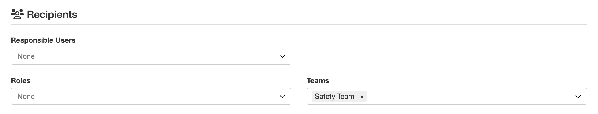 3. Navigate to the 'Recipients' section, where you can add or update responsible users, roles and teams who should receive the email notification.