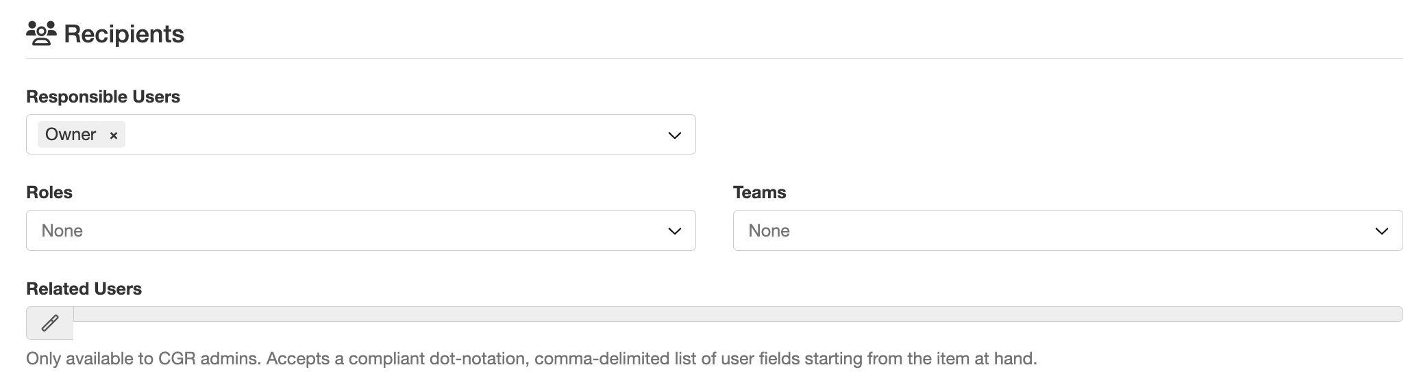 3. Scroll down to the 'Recipients' section, where you can add or update responsible users, roles and teams who should receive the email notification.