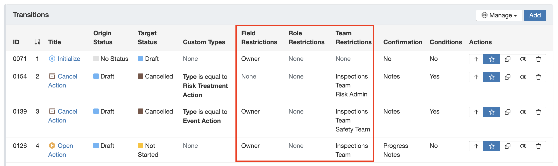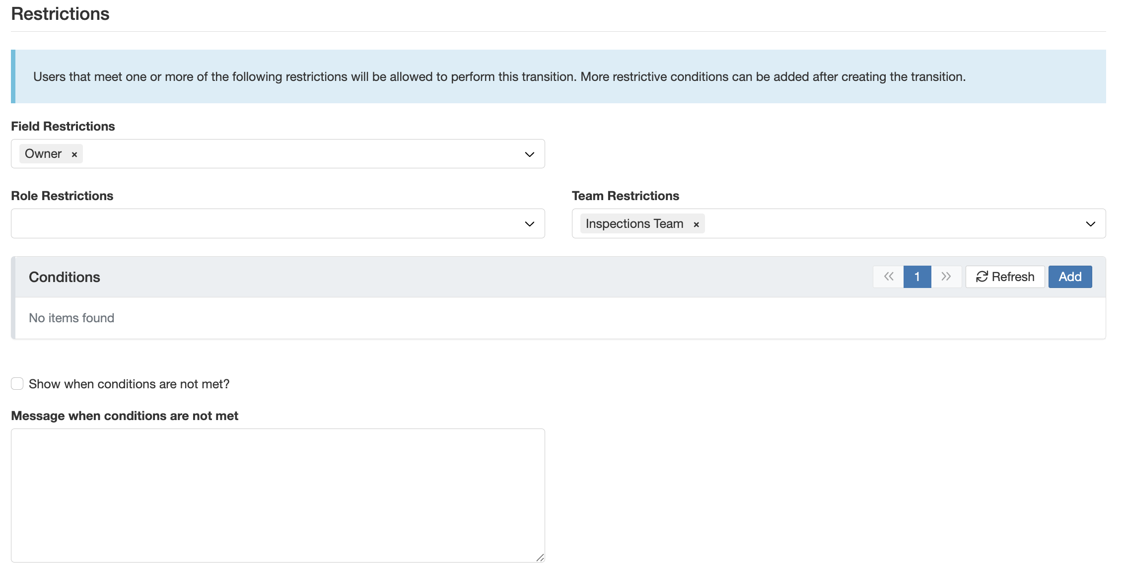 | Teams Restrictions | Transition is visible only to specific teams, e.g. Inspection Team. |