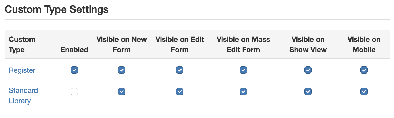 - To display the new field on the register page, ensure it is enabled for the relevant Custom Type and for the correct form (New Form and/or Edit Form).