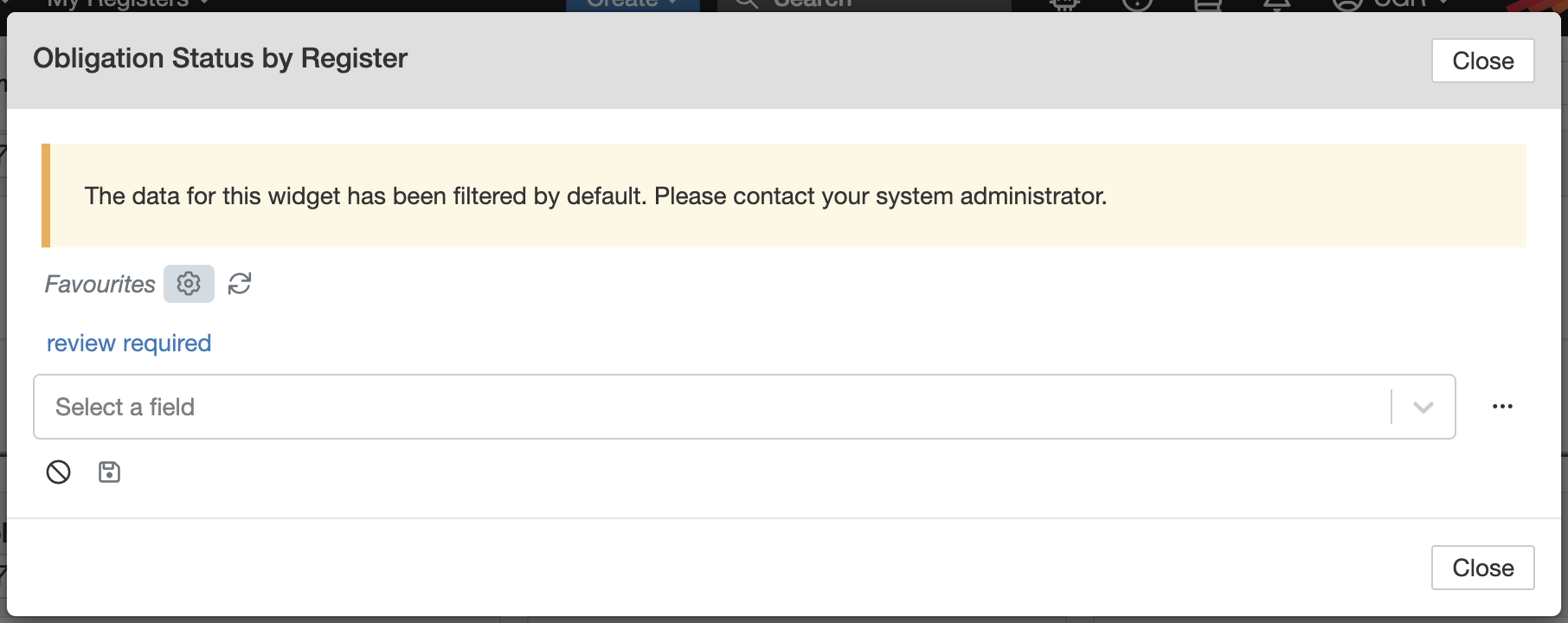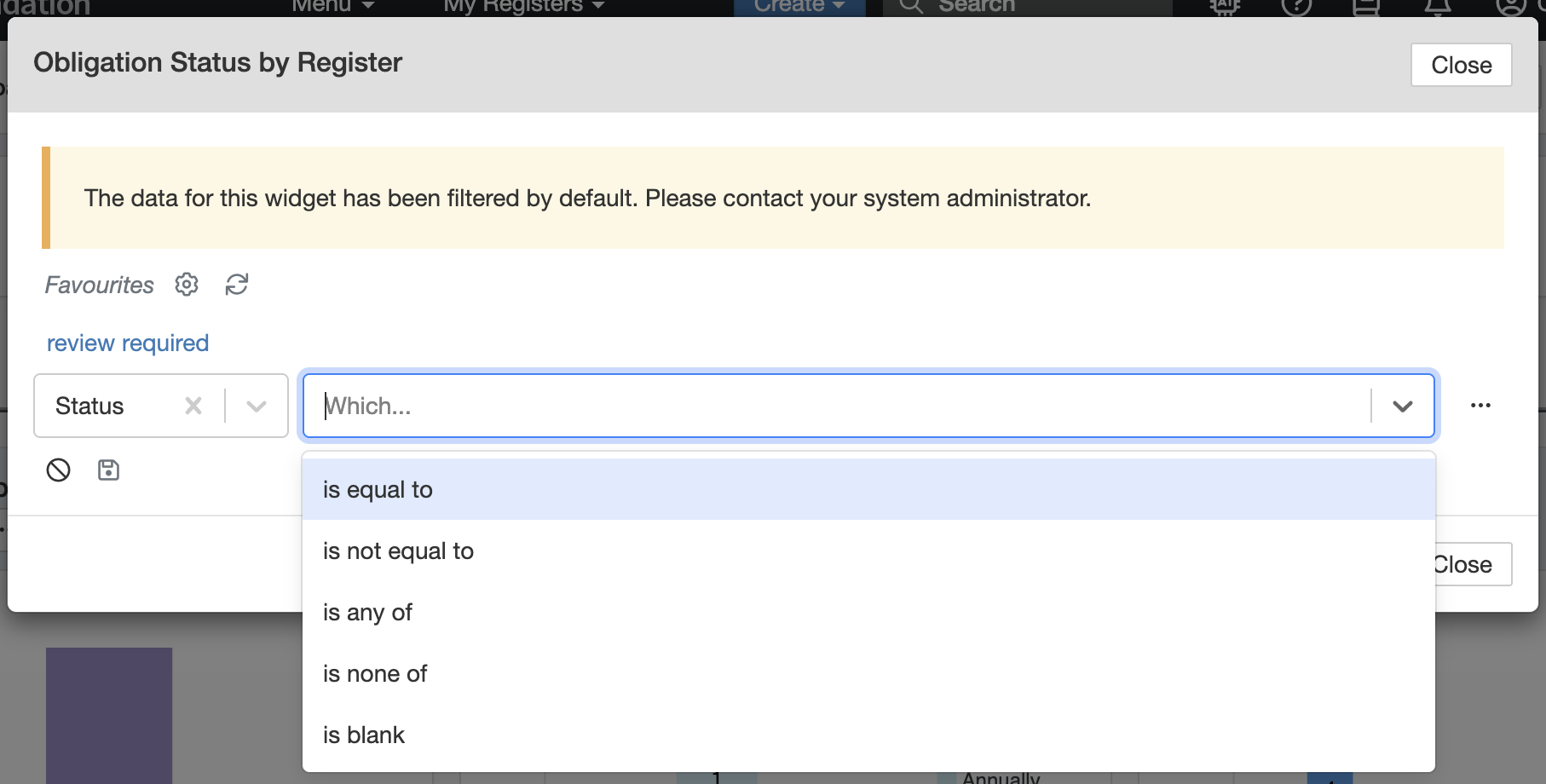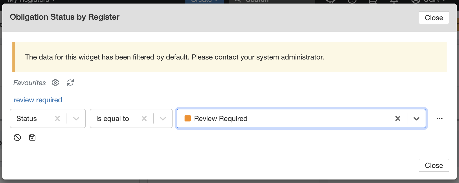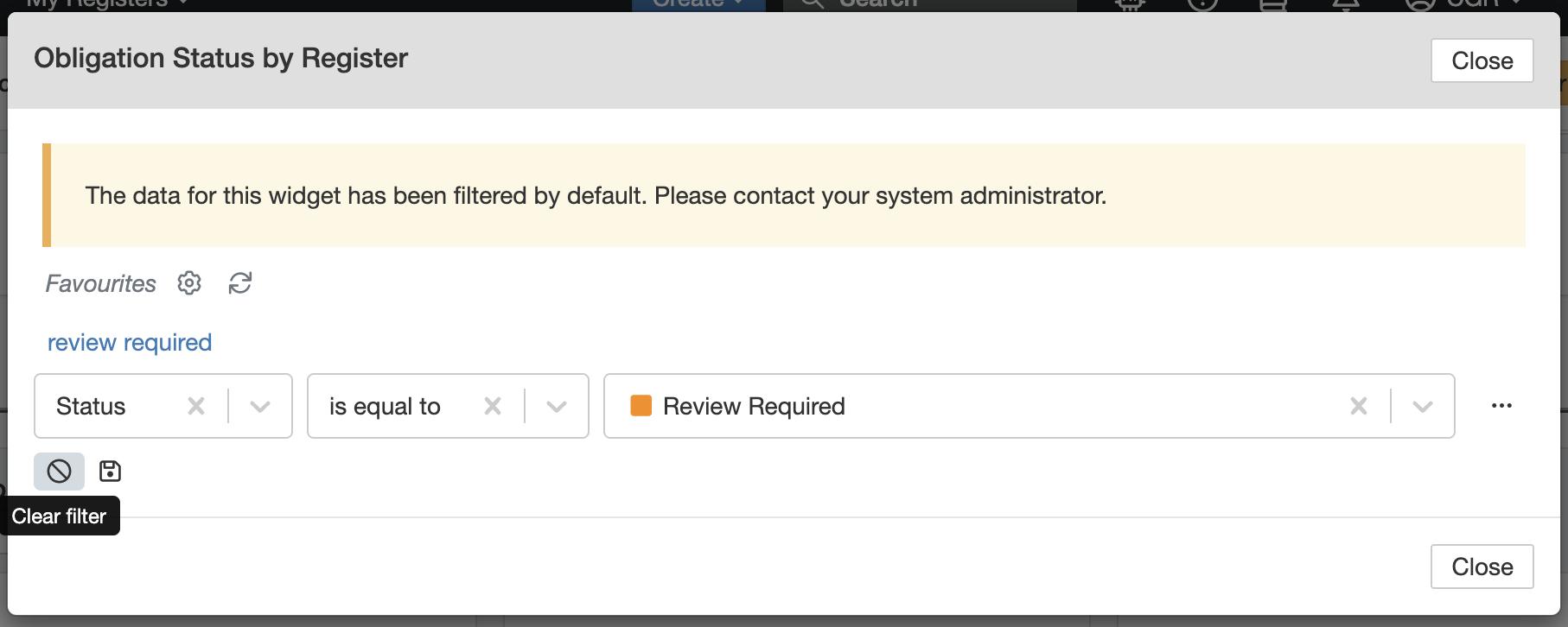 The widget will automatically refresh and display results based on your selected filter (e.g., only showing obligations marked Review Required). - Clear the filter