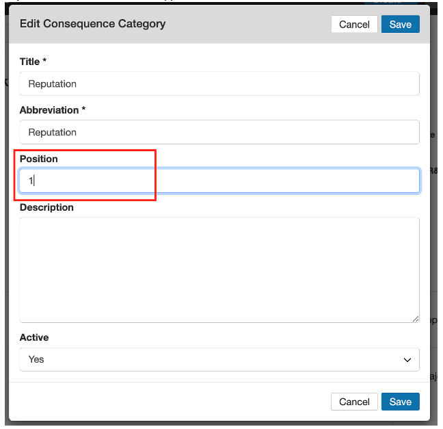 Each Risk Matrix can include multiple consequence categories, which are fully customisable. The order of these categories can be adjusted by a System Administrator.