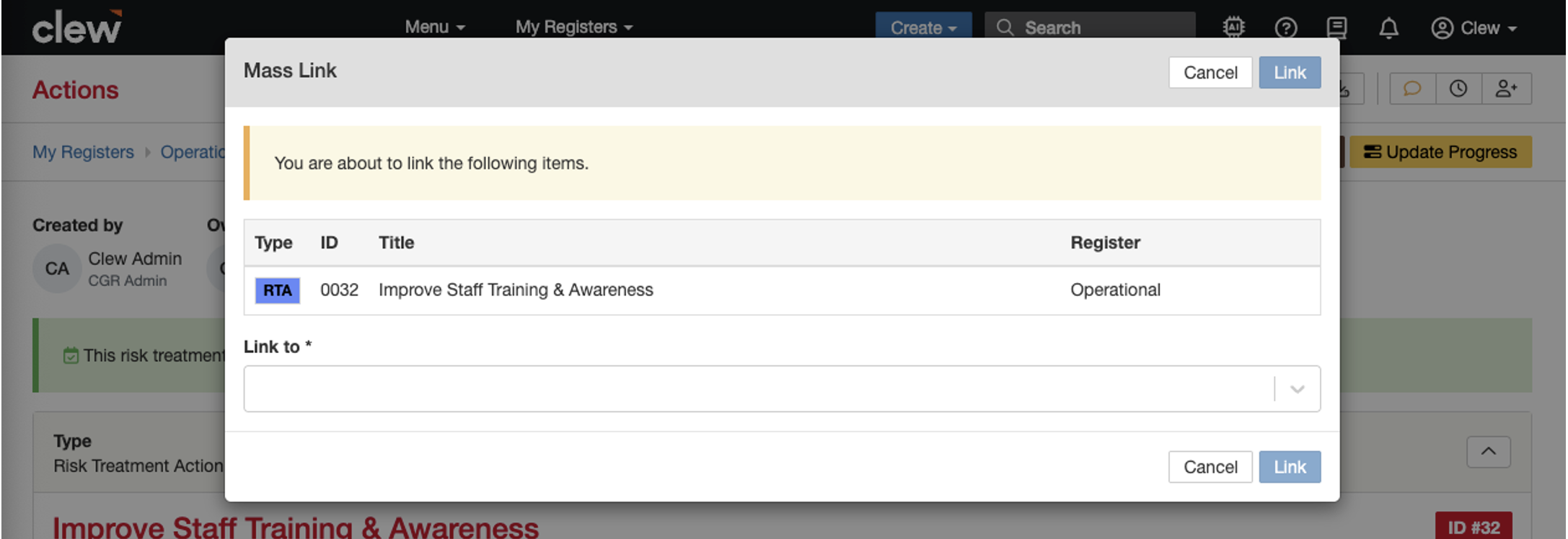 4. Select the module you want to link first, for example “Risk”. Link type will then appear. Select secondary. This will load the link to risk box, select as many as needed. In our example here we are picking three risks.